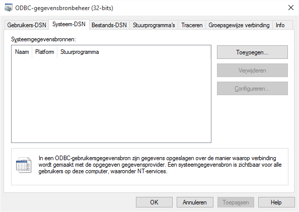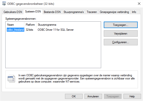 In het ODBC-beheerstool maken we een nieuwe DSN (gegevensbron) aan: selecteer de tab Systeem-DSN en klik Toevoegen. Selecteer uit de lijst drivers SQL server en klik op Voltooien.