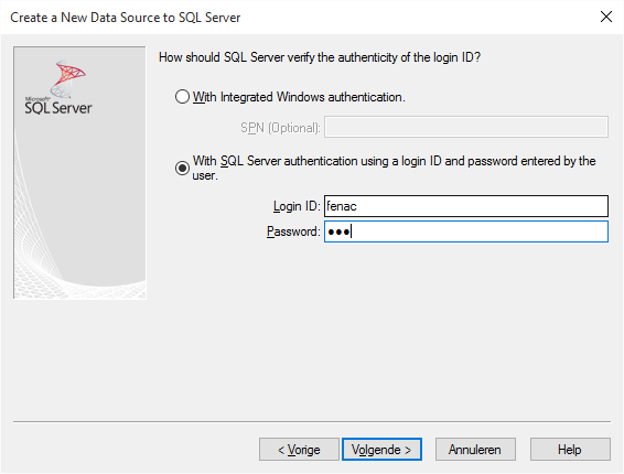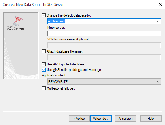 Kies in het volgende scherm voor SQL Server-verificatie en vul bij aanmelding-id de gebruikersnaam "fenac" in. Bij wachtwoord het bij de gebruiker "fenac" behorende wachtwoord. Vink verbinden met SQL server aan en klik volgende. Als "andere standaarddatabase" kiezen we in: "ac_friesland". Alle overige instellingen hoeven niet te worden gewijzigd.