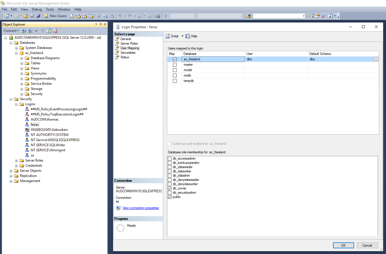 Maak in de database een gebruiker aan met de naam "fenac" en geef deze gebruiker de rol "db_owner".