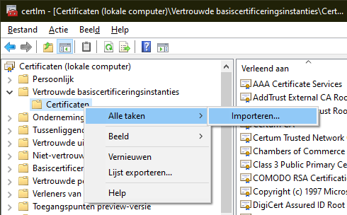 Installeer het CA-certificaat door certlm te starten vanaf de opdrachtprompt, of door "Computercertificaten beheren" te zoeken in Instellingen van Windows. In het venster met certificaten van de lokale computer selecteer je Certificaten -> Vertrouwde basiscertificeringsinstanties -> Certificaten. Vervolgens kies je via menu Actie, of het contextmenu, voor Alle taken en dan de opdracht Importeren. Klik Volgende, kies het bestand, kies weer Volgende, laat de selectie voor optie "Alle certificaten in het onderstaande archief opslaan" ongewijzigd en kies Volgende, klik uiteindelijk op Voltooien om het certificaat te importeren.