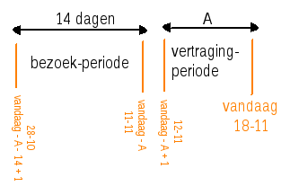 De afgelopen A dagen heten de administratieve vertraging. Daaraan voorafgaand zijn 14 dagen (twee weken) waarop geselecteerd wordt voor het uitnodigen. Een patiënt die het AC bezoekt in die 14 dagen, en ten opzichte van dat bezoek geen toekomstige afspraak heeft op het AC (in de vorm van een richtafspraak, afspraak, of bezoek dat in de administratieve vertraging valt), komt in principe in aanmerking voor een CQI uitnodiging. In het voorbeeld is (in het oranje) A=7 dagen vertraging en is het vandaag 18 november. De 7 dagen vertraging is inclusief vandaag, dus de vertraging-periode is vanaf de 12e. De 14 dagen ervoor, van 28 oktober tot 11 november, zijn de periode waarbinnen de patiënt een bezoek moet hebben gebracht an het AC. - codes_verbruiken moet ingesteld worden afhankelijk van de afspraak met KIWA over het gebruik van unieke codes, of codes per doelgroep.