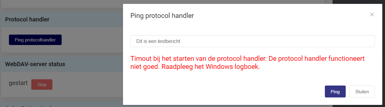 Als er een probleem is met de installatie van de protocol handler verschijnt de volgende melding: