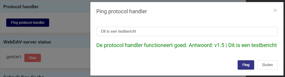 Onder Beheer -> Server status is een sectie "Protocol handler". Klik op "Ping protcol handler" en typ een bericht in de dialoog die verschijnt. Klik op de knop "Ping" om het bericht te versturen. Het duurt maximaal 30 seconden voordat er een bericht terugkomt van de protocol handler. Als de protocol handler goed is geïnstalleerd verschijnt een melding dat de protocol handler goed functioneert. Het antwoord bestaat uit het verstuurde bericht voorafgegaan door het versienummer: