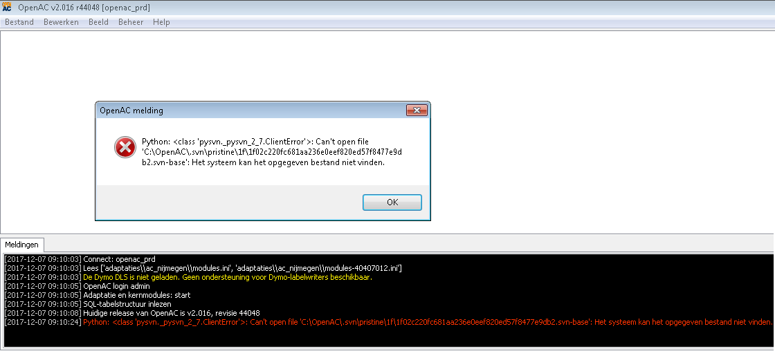 - Can't open file C:\OpenAC\.svn\pristine\1f\2354b2.svn-base': Het systeem kan het opgegeven bestand niet vinden.