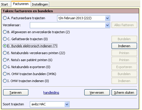 Voor het factureren van de AWBZ trajecten wordt hetzelfde factureerscherm als bij reguliere trajecten gebruikt. In het scherm kan men de soort trajecten selecteren. Voor AWBZ 'AWBZ traject Gezinsbegeleiding' en 'AWBZ traject AC' zijn de opties bij Soort trajecten. Bij het fiatteren als de optie Verzekeringsrecht controleren bij Vecozo aangezet is, wordt per cliënt het verzekeringsrecht gecontroleerd.