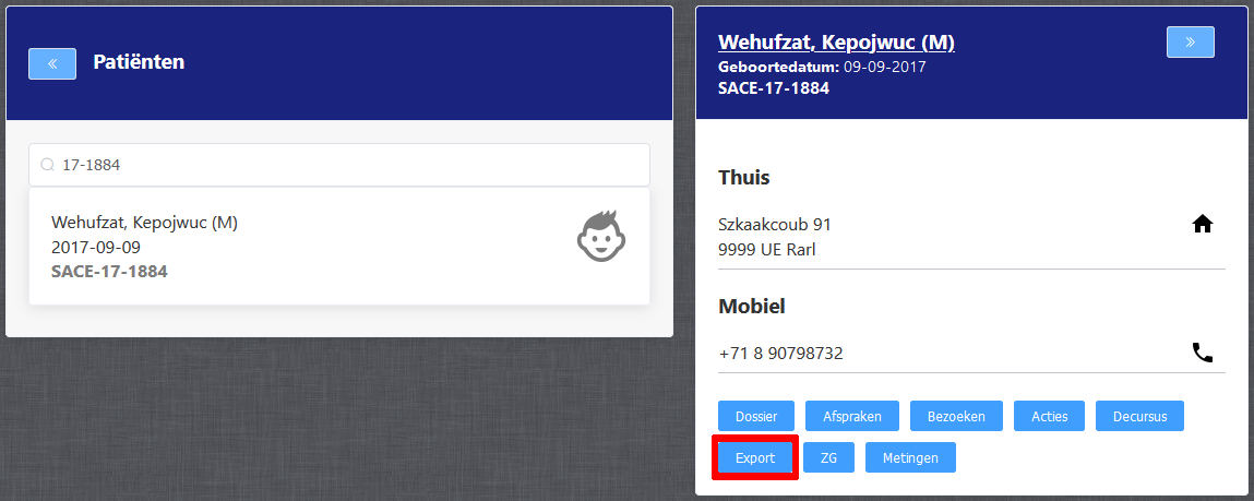 Zoek de patiënt op en klik op de naam in de lijst. Je kunt de export starten met de knop "Export" in het patiëntinformatiescherm.