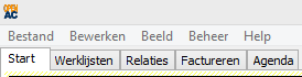 - Met de toetsencombinatie ctrl tab wissel je van actieve tab. Met deze toetsencombinatie maak je in het plaatje hieronder achtereenvolgens de schermen Start, Werklijsten, Relaties, Factureren en de Agenda actief.