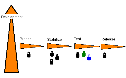 Het maken van een release omvat vier stappen. In tijd gemeten zou dit drie a vier weken duren, waarbij het niet alle tijd opsoupeert: tijdens het maken van een release kan de ontwikkeling van de volgende versie gewoon doorgaan.