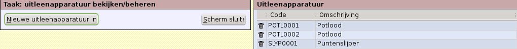 In het codetabellenscherm kan de lijst met uitleen-apparatuur beheerd worden. De lijst-weergave geeft, zoals elke codetabel-lijst, een knop om nieuwe gegevens in te voeren en een lijst van de bestaande gegevens. De lijst-weergave bevat alleen de code van elk apparaat en de omschrijving ervan (de voorbeeldapparatuur bestaat uit twee potloden en een puntenslijper).