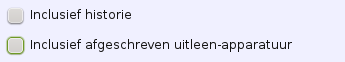 De rapportage over uitleen-apparatuur is beschikbaar voor iedereen. Bij het opvragen van de rapportage zijn er twee vinkjes die kunnen worden gezet: het vinkje inclusief historie maakt een extra sheet aan met de volledige uitleenhistorie (wie heeft het apparaat wanneer gehad en alle aantekeningen) van de apparatuur; het vinkje inclusief afgeschreven uitleen-apparatuur haalt de beperking weg dat alleen courante, niet-afgeschreven apparatuur wordt gerapporteerd.