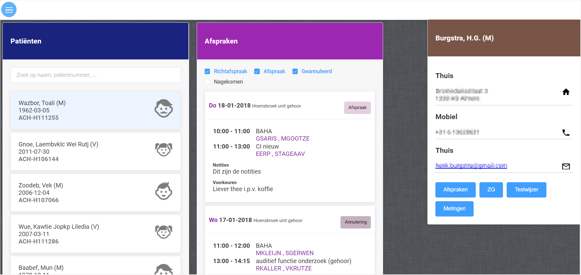 Vanaf deze build is het mogelijk om een overzicht op te vragen van alle afspraken van een patiënt. Klik op een patiënt en vervolgens op "Afspraken". De afspraken zijn te filteren op soort.
