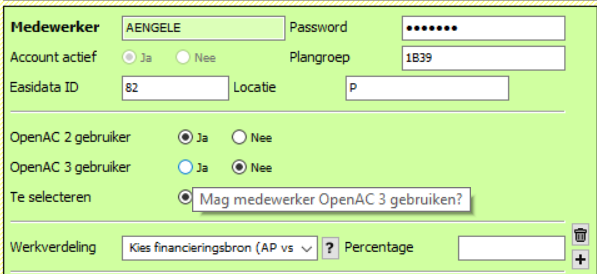 - Niets ingevuld achter "OpenAC 3 gebruiker" betekent dat de gebruiker niet mag inloggen in OpenAC 3.